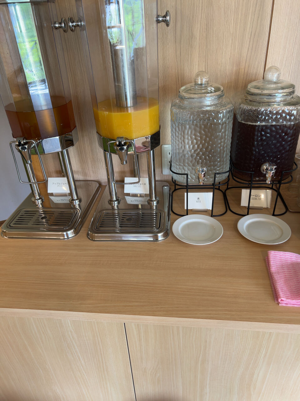 水、ウーロン茶、オレンジジュース、アップルジュース。