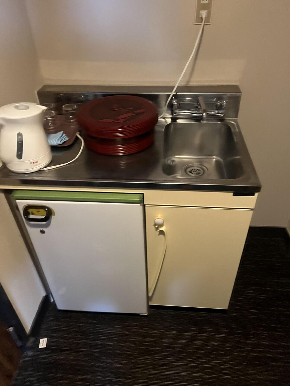 洗面台、温水ポッド、冷蔵庫。