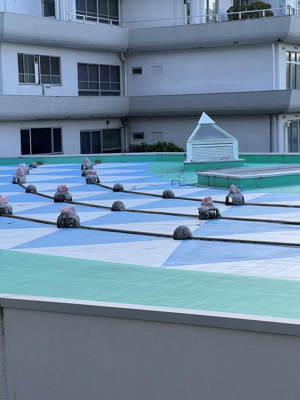 窓の外の景色。よく見ると電灯の上にローズクオーツを乗せている。