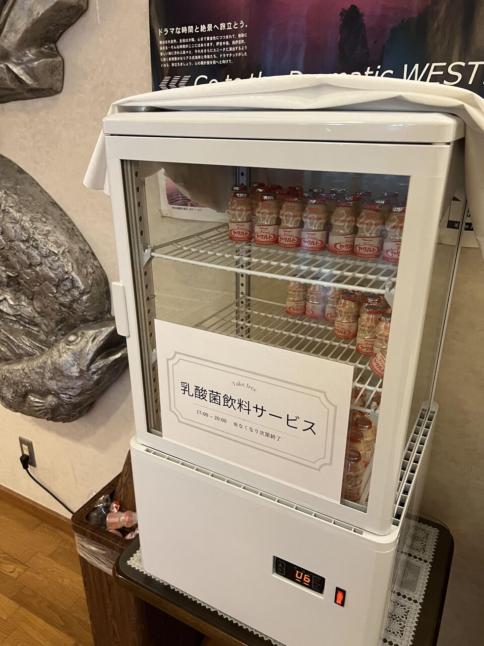 大浴場前の休憩所でヤクルト無料。