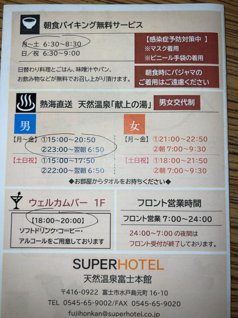 静岡県富士市にある「スーパーホテル天然温泉富士本館」に宿泊してきました。ウェルカムバーで酒が飲み放題なのと一泊無料朝食付きで5000円~と格安なのが宿泊の動機です。
