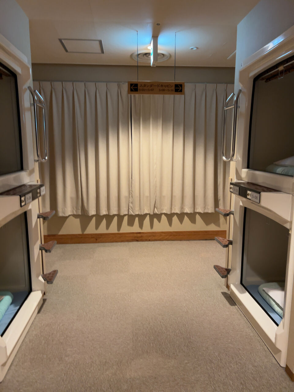 キャビンルームの出入口。このホテルはフリースペース宿泊、スタンダードキャビン、デラックスキャビン、個室と様々な宿泊方法を選択できる。フリースペースが一番安く個室が一番高い。