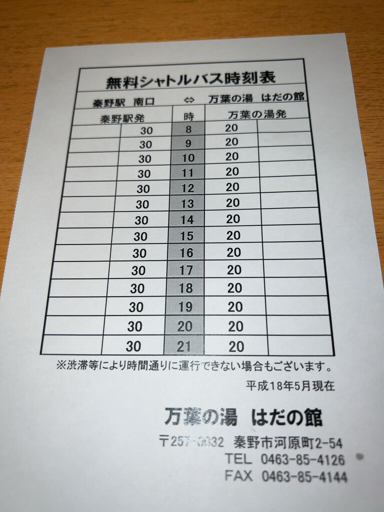 秦野駅からの無料シャトルバス時刻表。