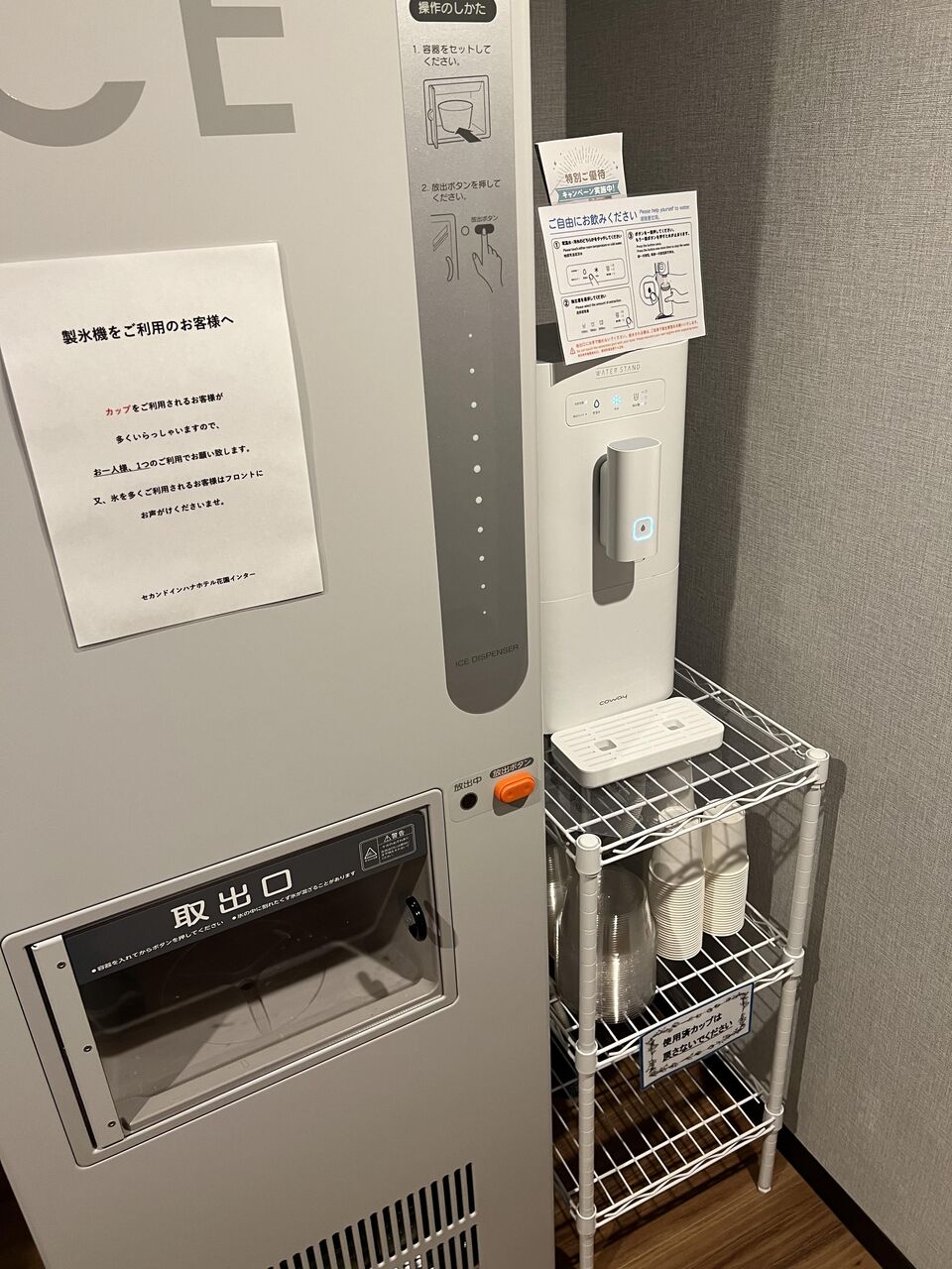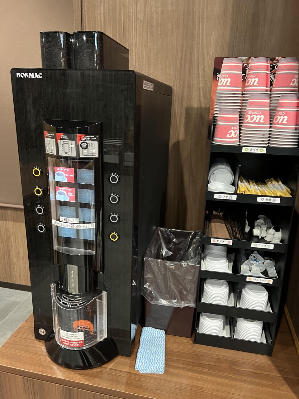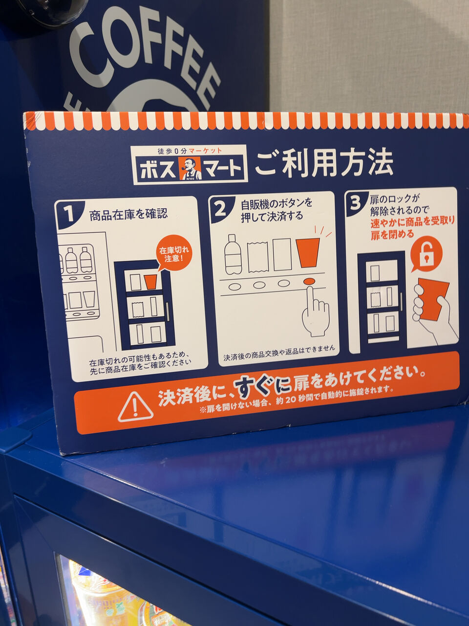 スナック、パン、カップ麺販売。自販機で購入してBOXを開けて商品を受け取る。最初戸惑ること必至。