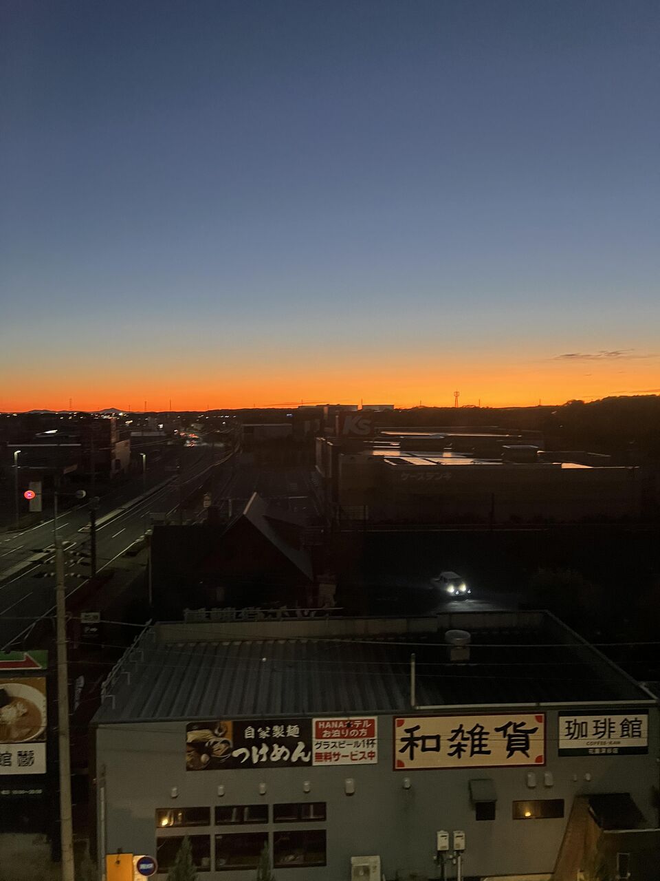 窓の外の景色。夕食に利用した三ツ矢堂製麺が見える。 ハナホテル宿泊者はビール一杯無料。