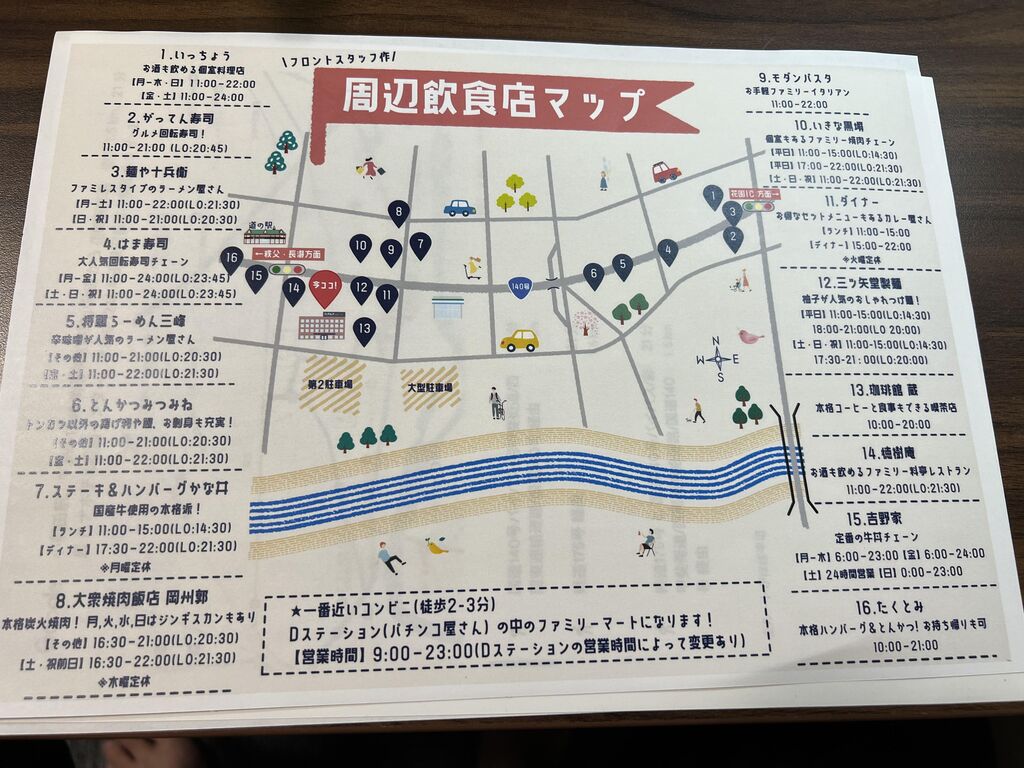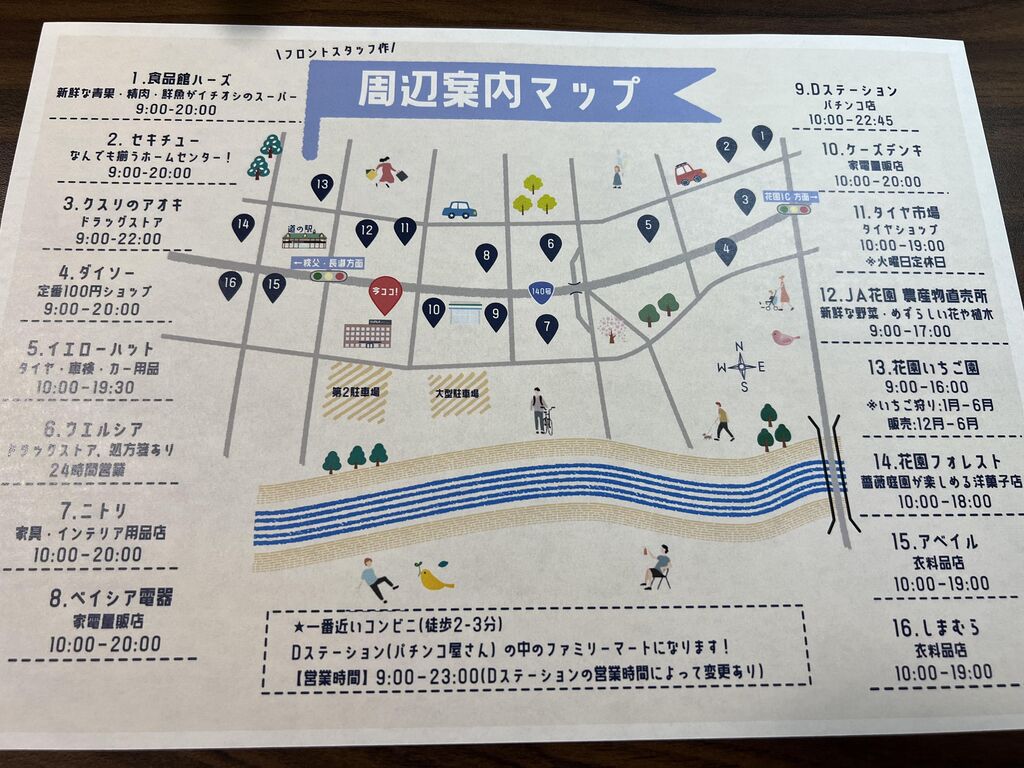 周辺案内マップ。こういうきめ細かいサービスがハナホテルの魅力。