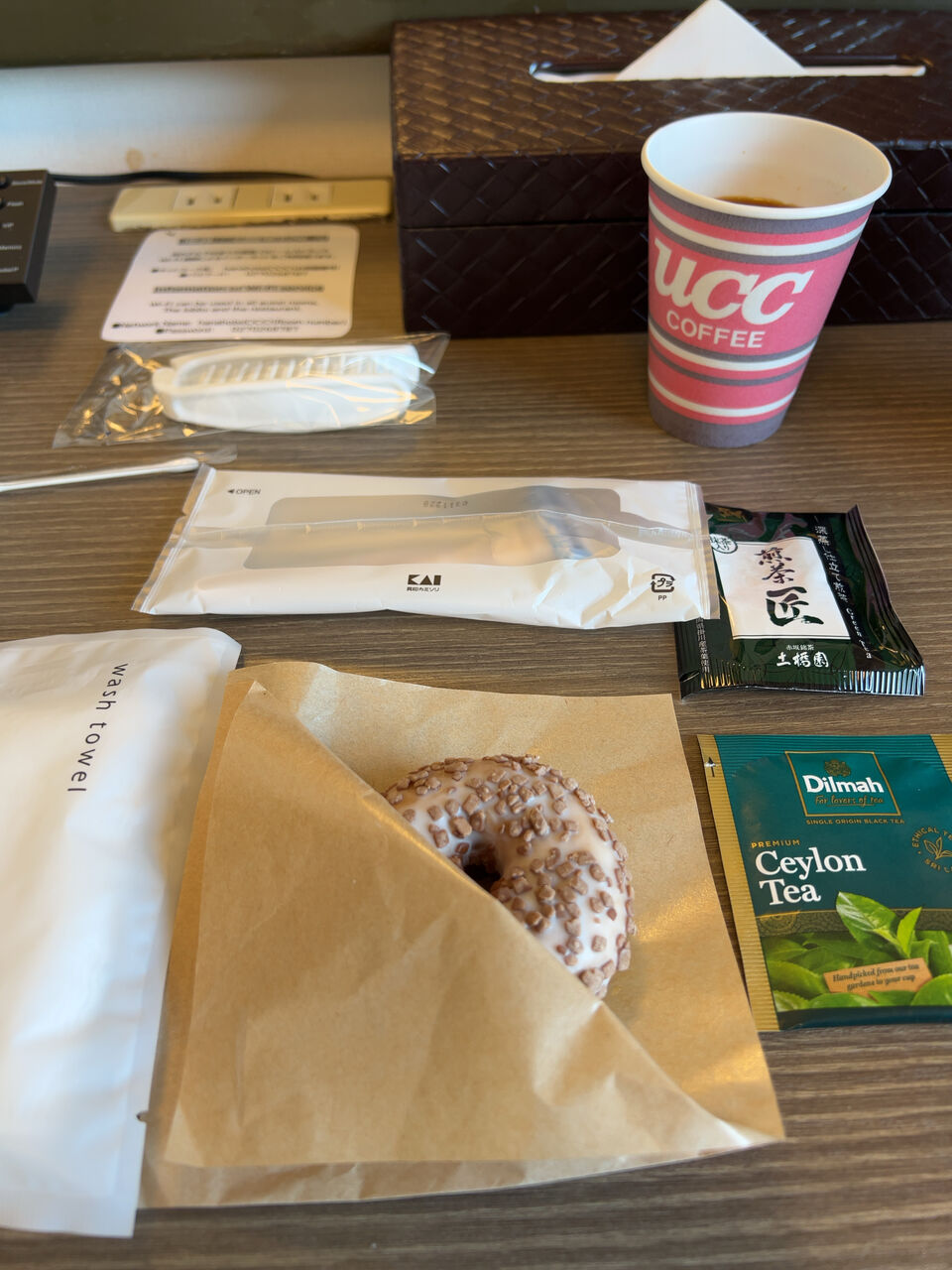 ドーナッツ、アメニティー、コーヒー。ドーナッツ(゚д゚)ウマー!