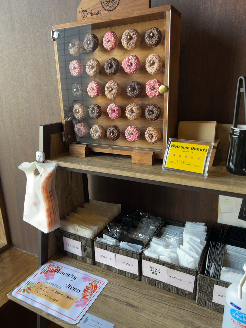 ウェルカムドーナッツ、アメニティーバイキング。ドーナッツは各1個だけ。