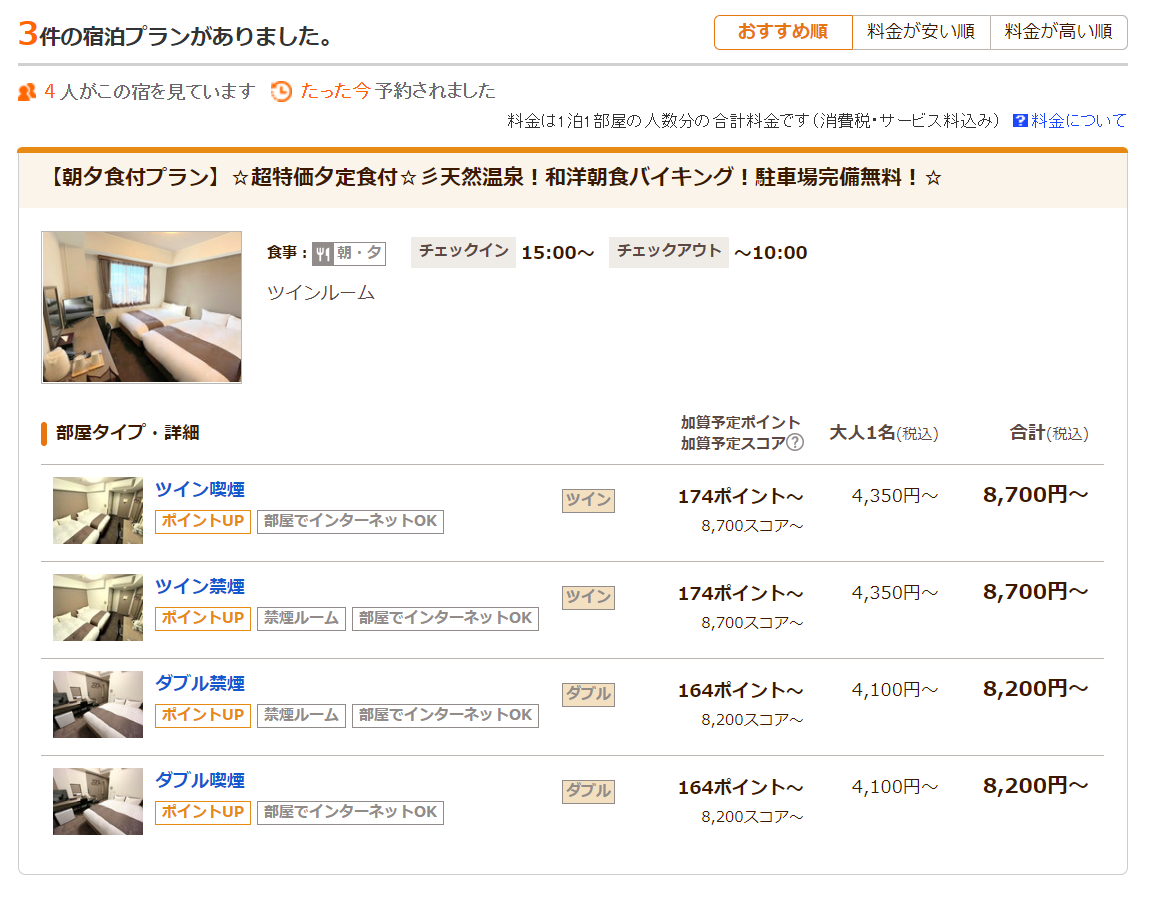 ちなみに私が価格を言う場合、じゃらんか楽天トラベルで表示された最安価格を言うことにしています(画像はじゃらん)。もちろん、時期やキャンペーン、人数によって変動しますので変わる場合も多々。というわけで参考程度に。それにしても、温泉付きで1泊2食4100円という価格は驚異的過ぎる。