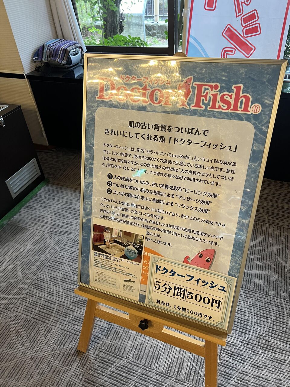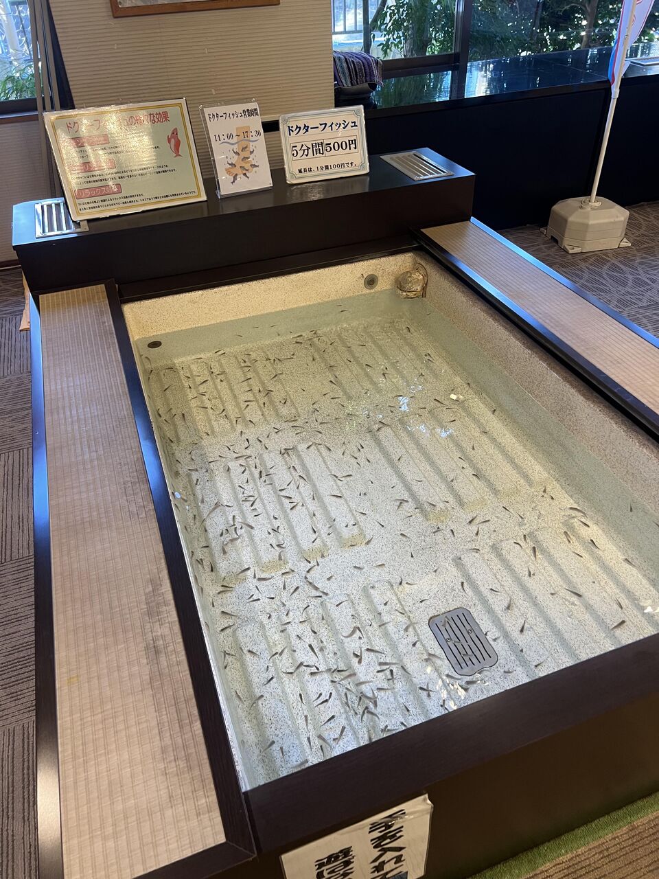 ドクターフィッシュ。足を投げ出すと足の角質を魚が食べてくれる。昔5分間500円を鬼のような設定と思ったけど、相も変わらずの設定。