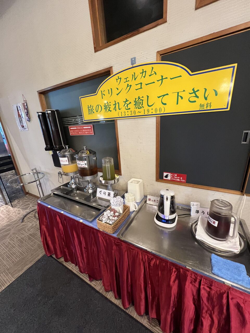 ウェルカムドリンク。13:30~19:00まで。オレンジジュース、リンゴジュース、ぐり茶、ホットコーヒー、ほうじ茶。