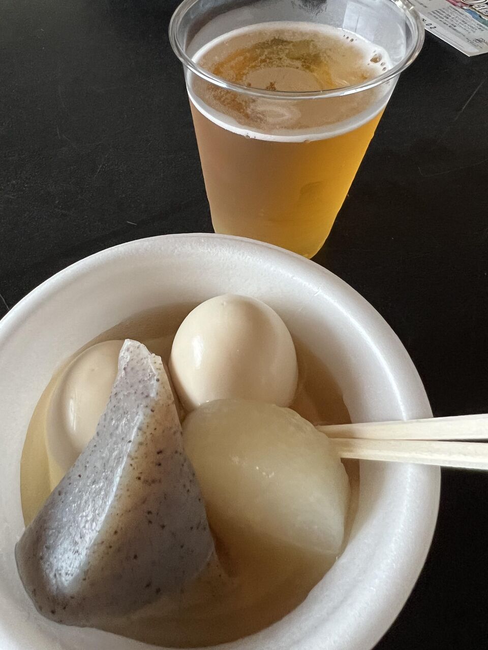チェックイン時からのハッピーアワー時は、おでん、肉まん、ポップコーンをつまみに酒を飲むことができる。