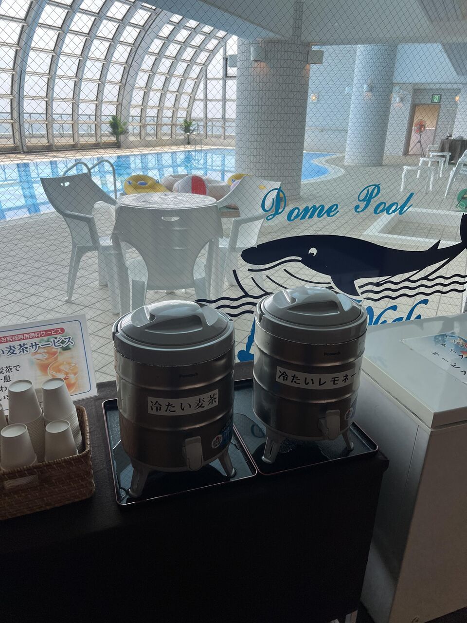 プール脇に水、レモネード、麦茶、アイスサービス。