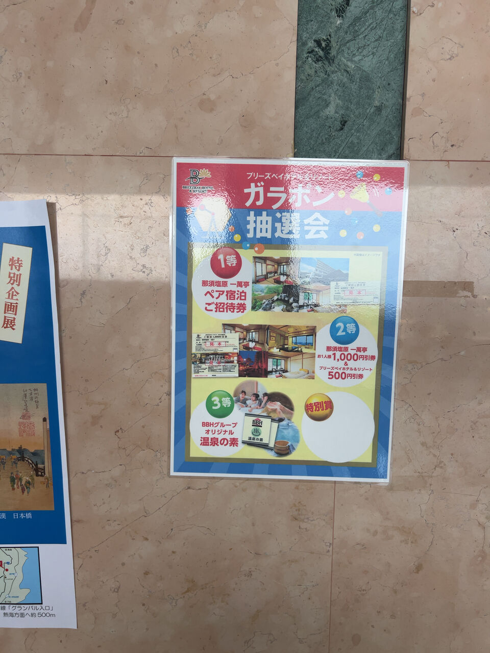 ガラポン抽選会。今まで2等しか当たったことない。やっぱ2等だった・・・。宿泊割引券なんだけど、公式ページの予約でしか利用できないんですよね。代理店のキャンペーン価格の方が安いので使ったことないです。1等とはたいそうなこと言わず、3等の温泉の素が欲しい。