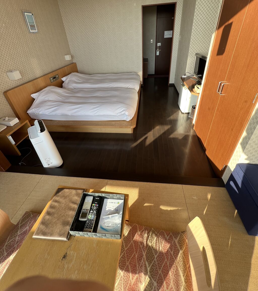 ホテルは元国民宿舎なんだけど、そこそこ値が張るホテルなだけあって、部屋はリフォームされていた。ウェルカムドリンクは充実していたが、夕食は全国割を使用した場合では価格相応。朝食は簡素な弁当で正直、価格負けしていた。