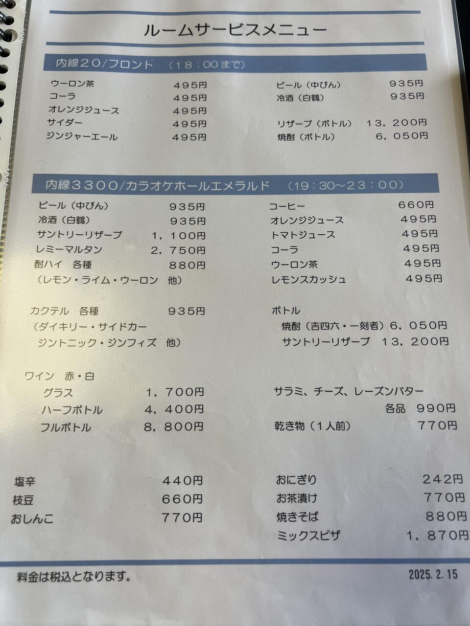 ルームサービスメニュー。カラオケホールエメラルドのメニューもある。ルームサービスと価格は変わらない。