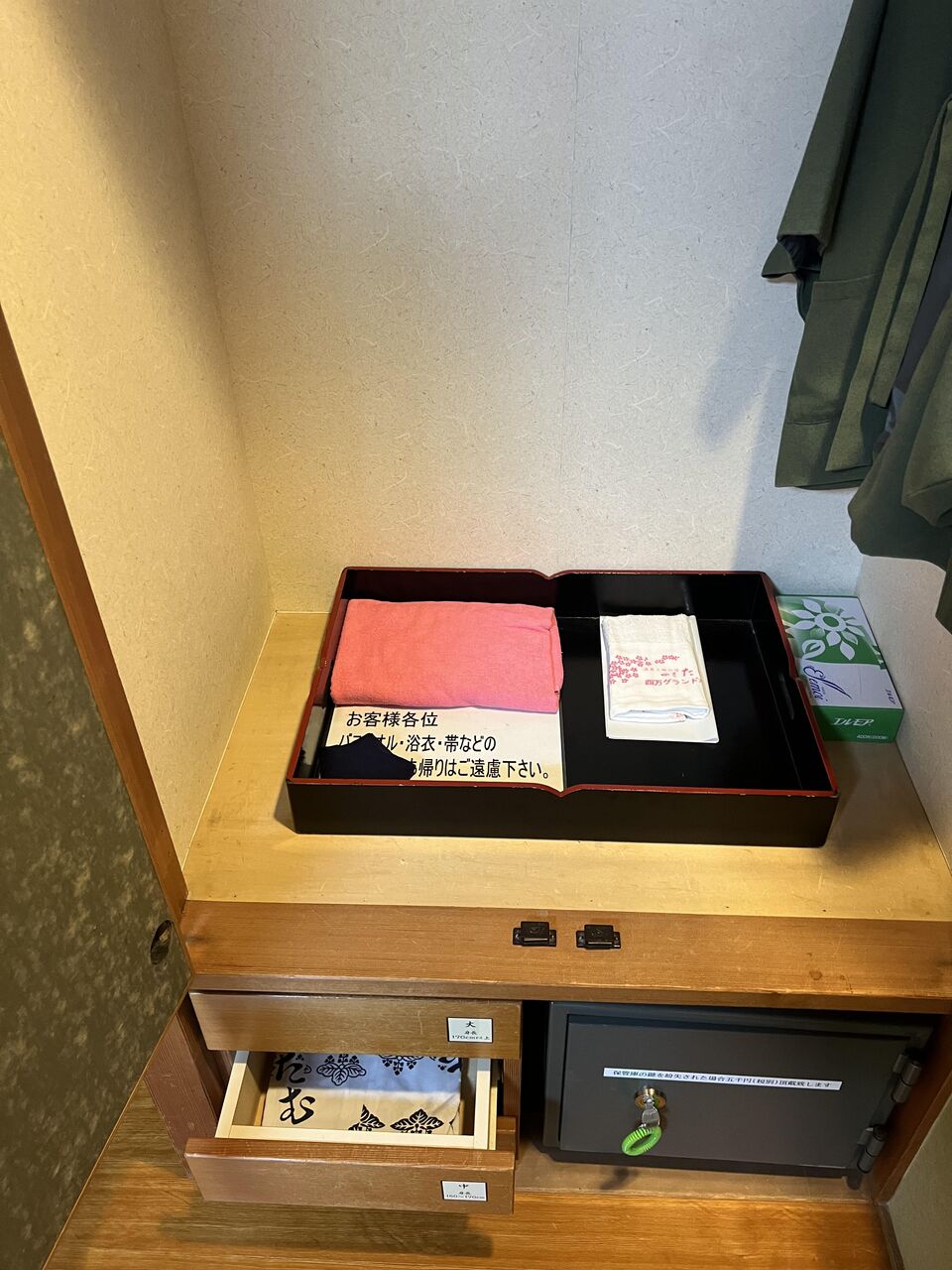 金庫、浴衣、タオル。