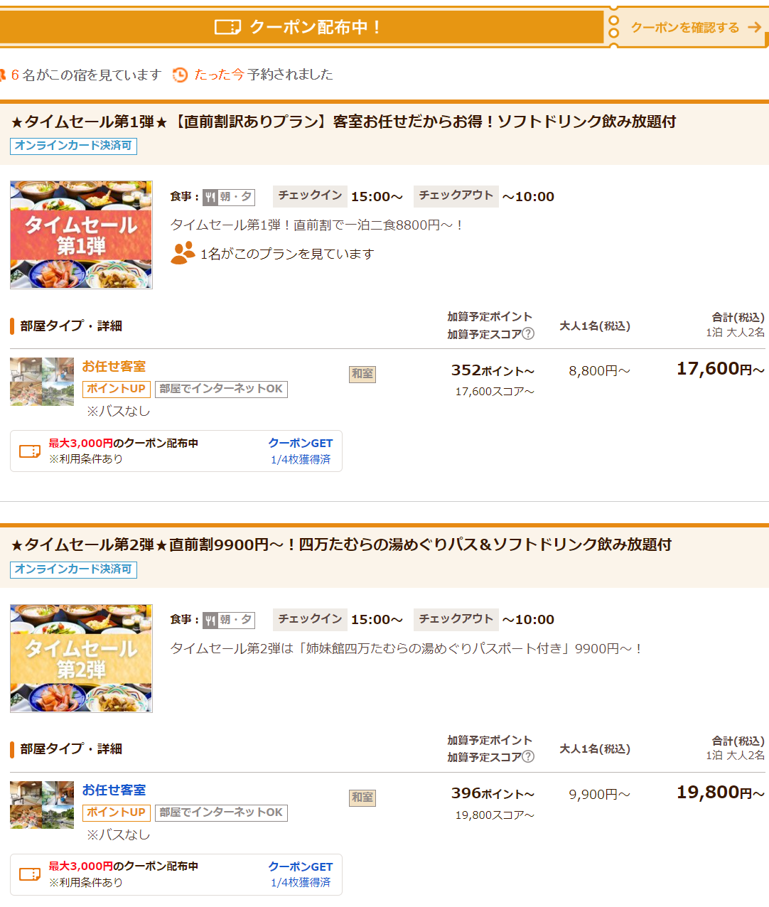 じゃらん平日最安値一泊二食8800円~。