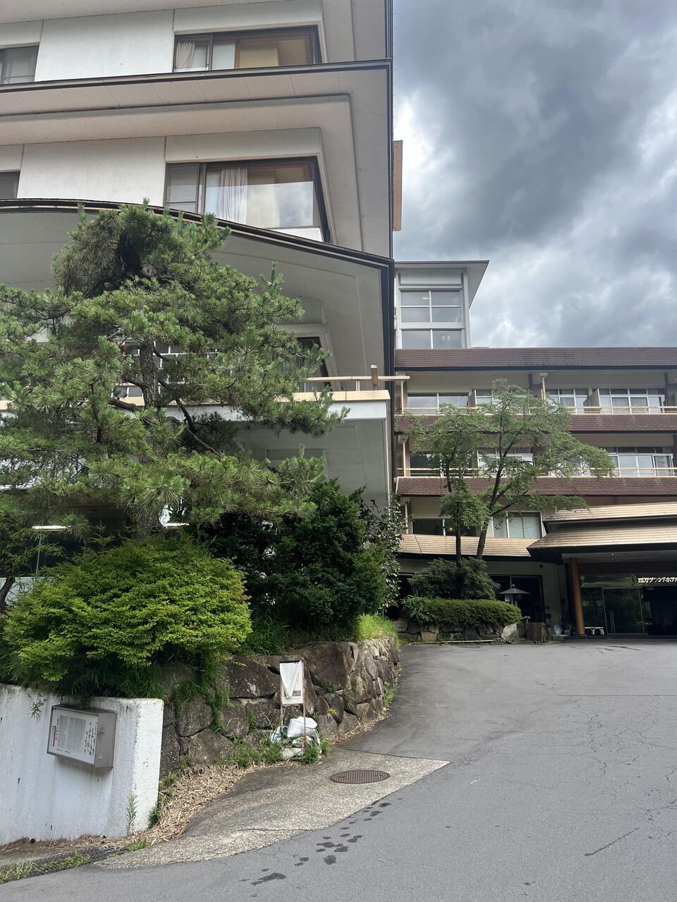 移動させられた駐車場の目の前にホテルがあるけど、入口は見つからない。しかたなくホテルの本館の入り口まで徒歩で移動した。