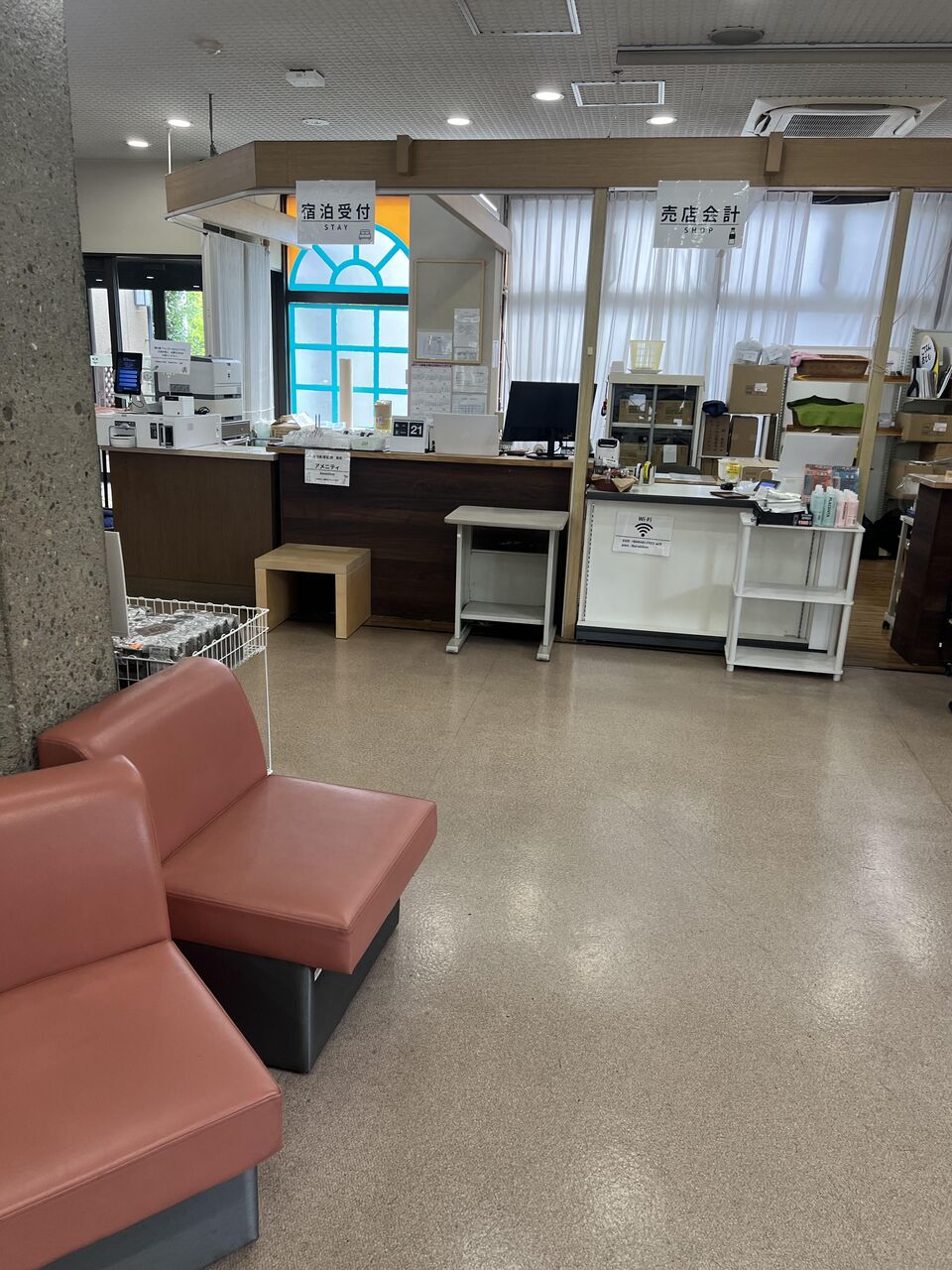 フロントだった場所。電子レンジと温水ポットが置かれている。