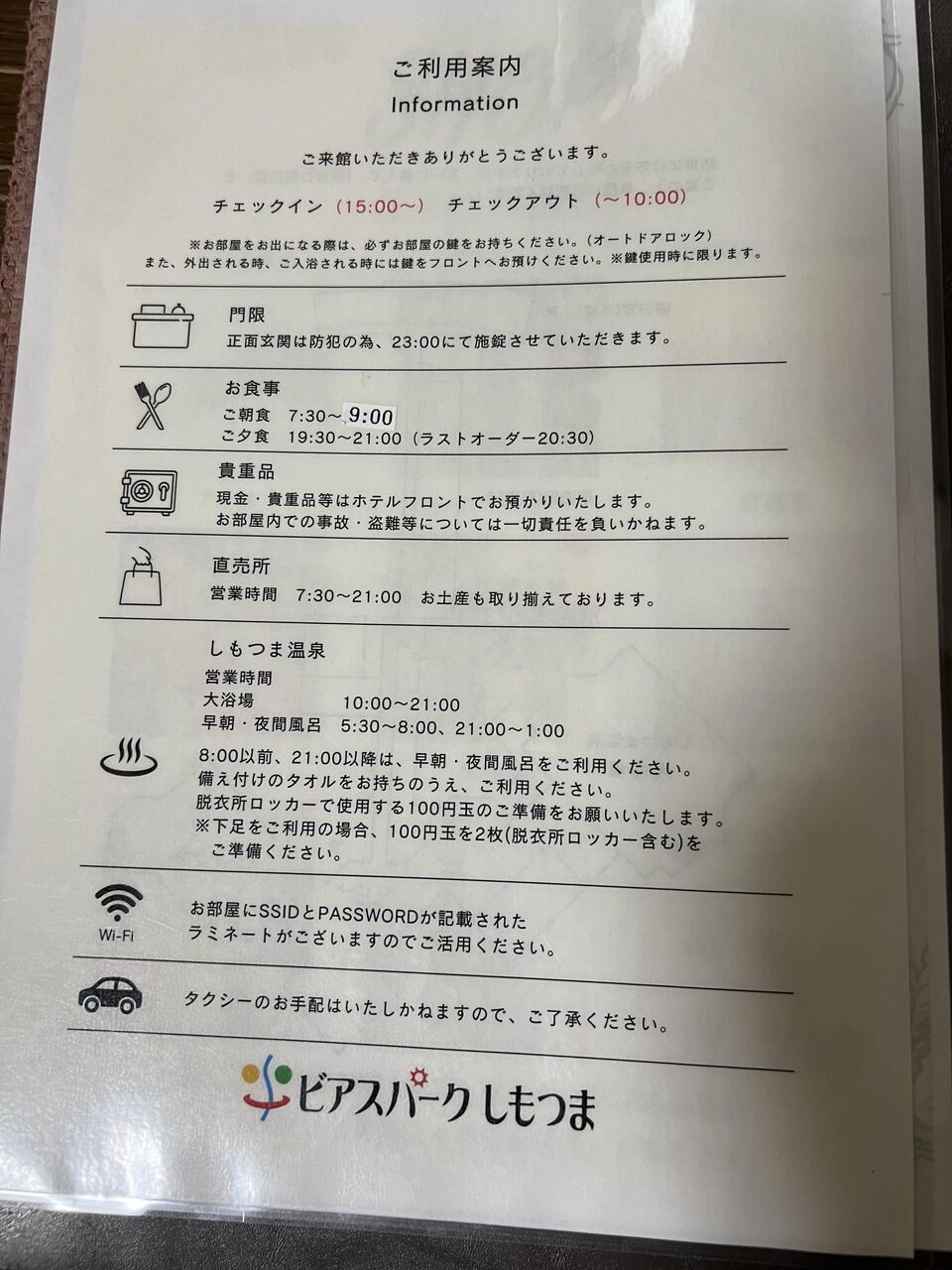 総論: ビアスパークしもつまには地ビール工房があるので夕食に昔あった地ビール飲み放題があるかと思いきや無くて、レストランで地ビール頼むにも普通のビールよりも高値で面食らった。おそらく運営会社が変わった事が原因なんだろうと思う。 昔のフロントはそのまま残されていて、フロントで何度も呼びかけていたんだけど、しばらくして新しいフロントが大浴場施設入口の前にできていたのに気が付いた。事情を察してこっちを向いているスタッフは私に声掛けくらいすべきだと思った。