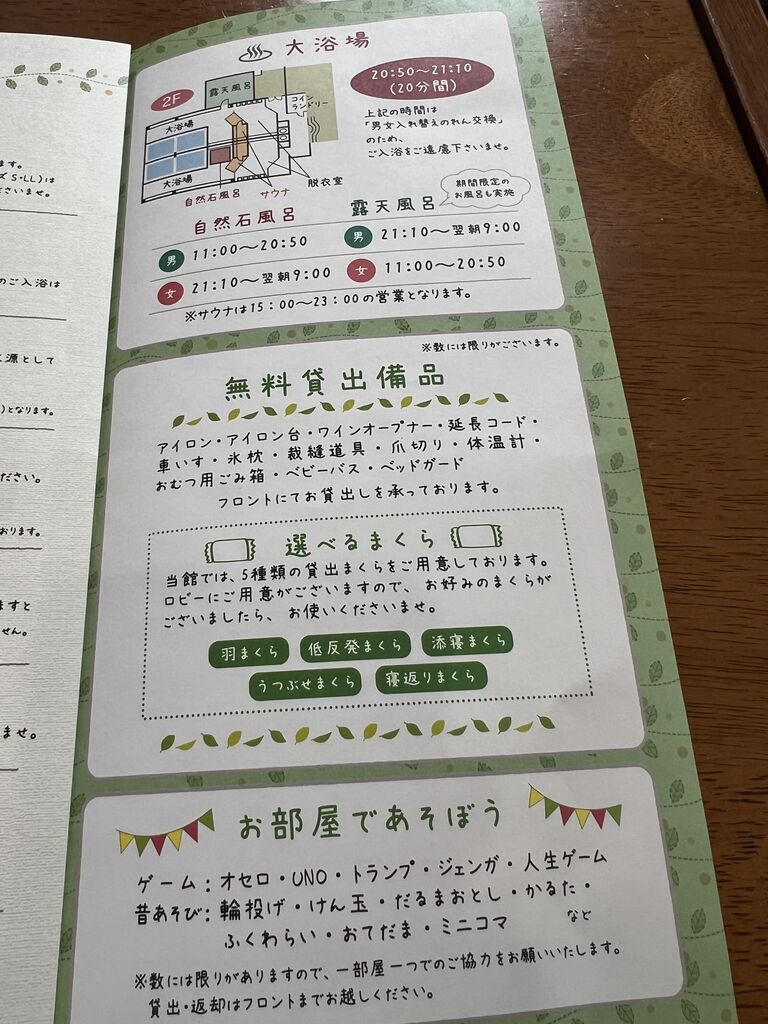 ホテル案内。その昔、宿泊者は姉妹館である池の平ホテルの大浴場を無料で利用できたのだけど、現在は500円の割引となった・・。温泉は深夜入り放題なのが嬉しい。