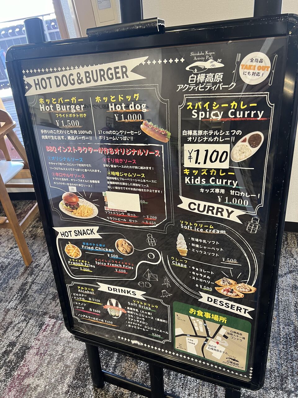 白樺高原アクティビティーパーク。ホットドックやカレーなどが食べられる。