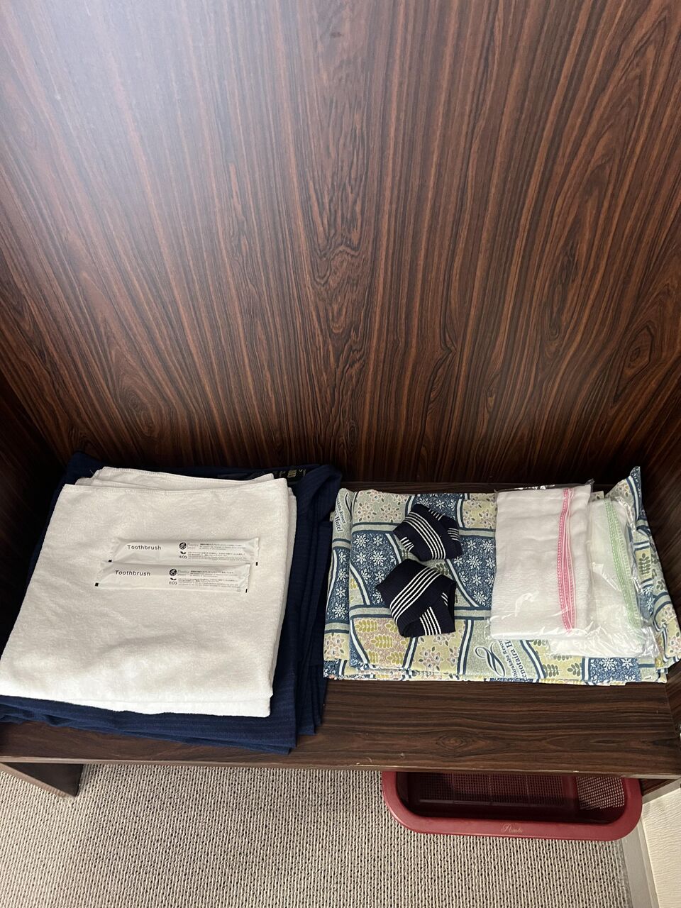 タオル、浴衣、帯、歯ブラシ。