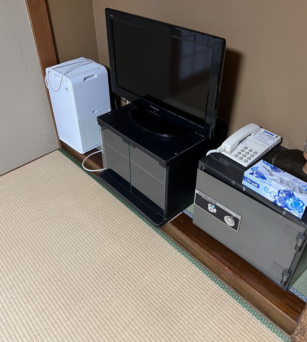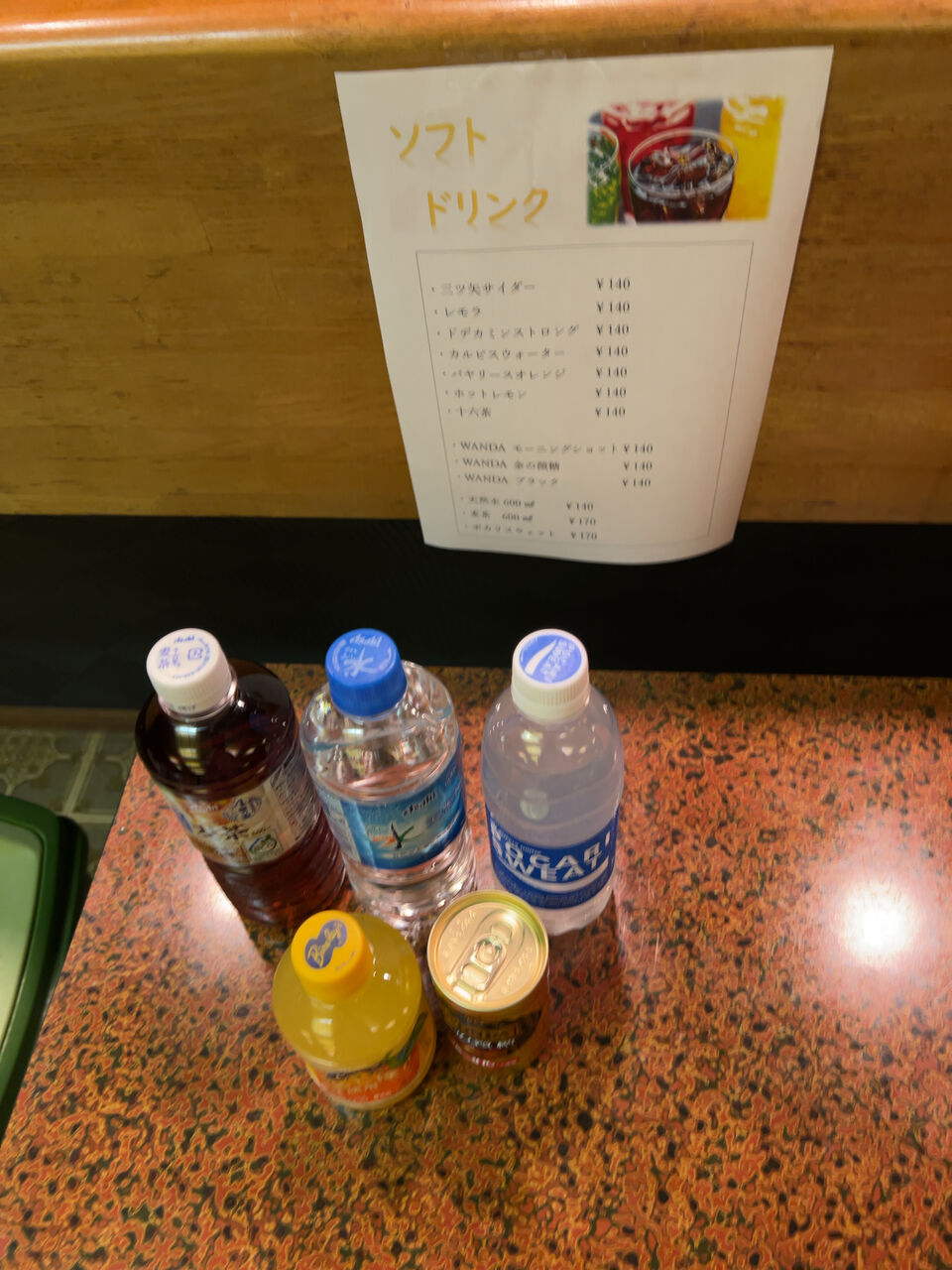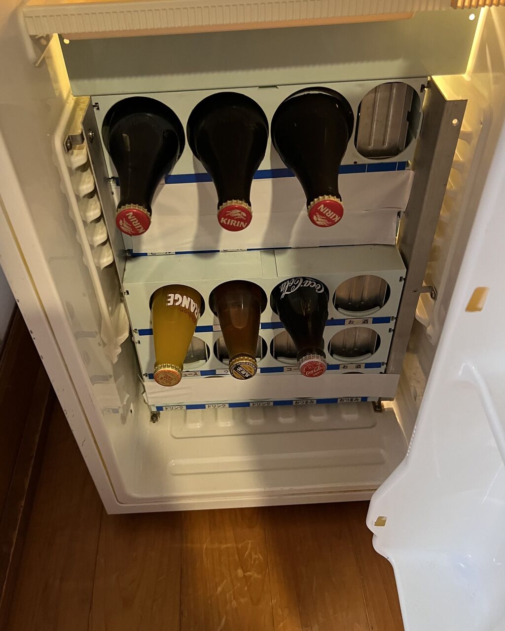 冷蔵庫。あらかじめ酒やジュースが入っている昭和な感じ。