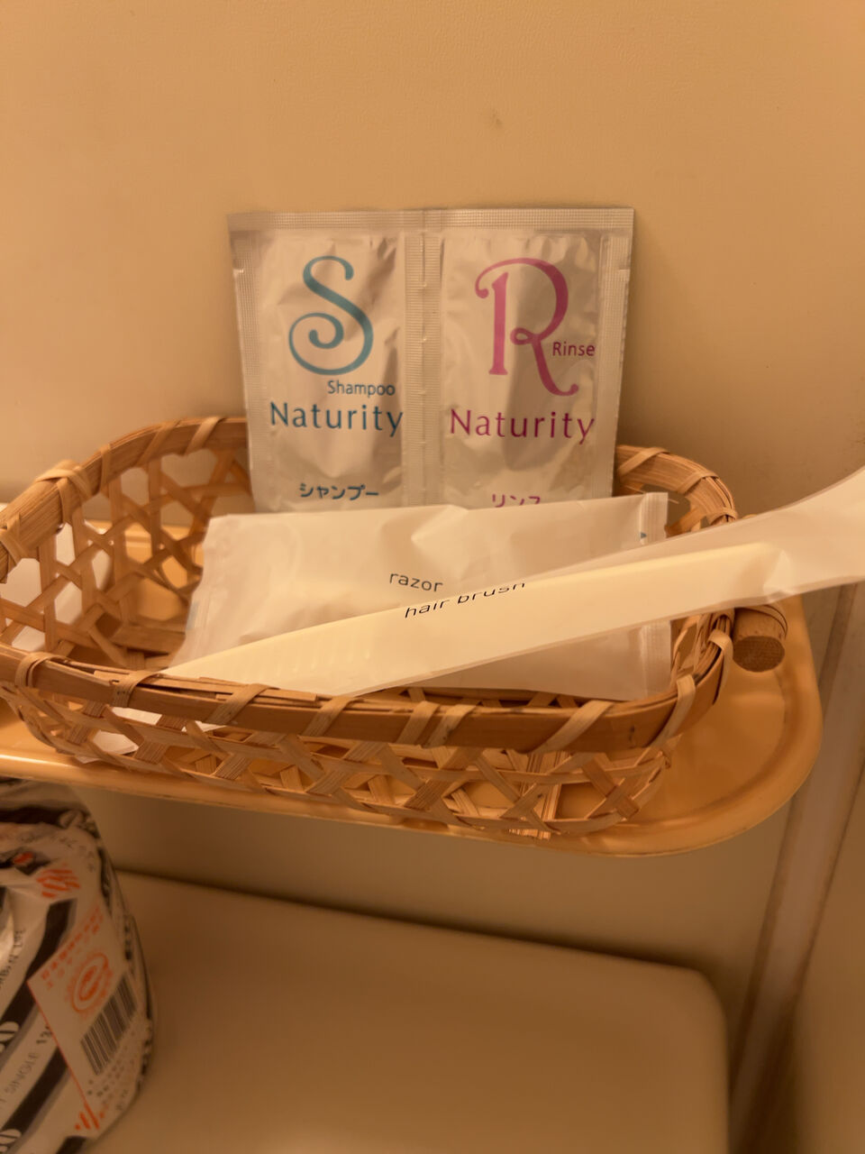 シャンプー、リンス、ヘアブラシ、剃刀。