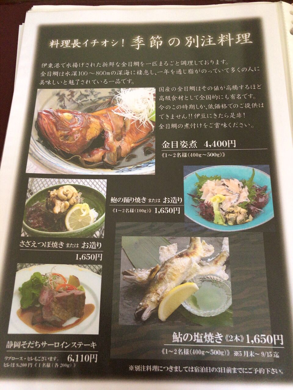 別注料理の紹介。オプション料金が高いのがゴルフ場ホテルだと納得。